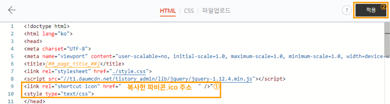 4-1. HTML 탭으로 넘어가서 Ctrl+F 를 눌러 shortcut 검색 후, 아래의 첨부이미지를 참고하여, 복사한 파비콘.ico 링크 주소 입력 후 [ 적용 ] 버튼을 누릅니다.