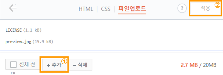 2. 파일업로드 탭에서 파비콘. ico을 추가 후 [ 적용 ] 버튼을 누릅니다.